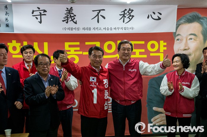 (대구=포커스뉴스) 김무성 새누리당 대표가 30일 오후 대구 동구 새누리당 동구갑 정종섭 후보 선거사무소를 방문 하고 있다.