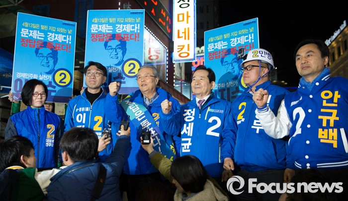 (서울=포커스뉴스) 4.13총선 공식선거운동 첫날인 31일 오전 서울 중구 동대문 신평화시장 앞에서 김종인(왼쪽 세번째) 더불어민주당 대표가 공식 선거유세에 앞서 취재진에게 출사표를 던지고 있다.