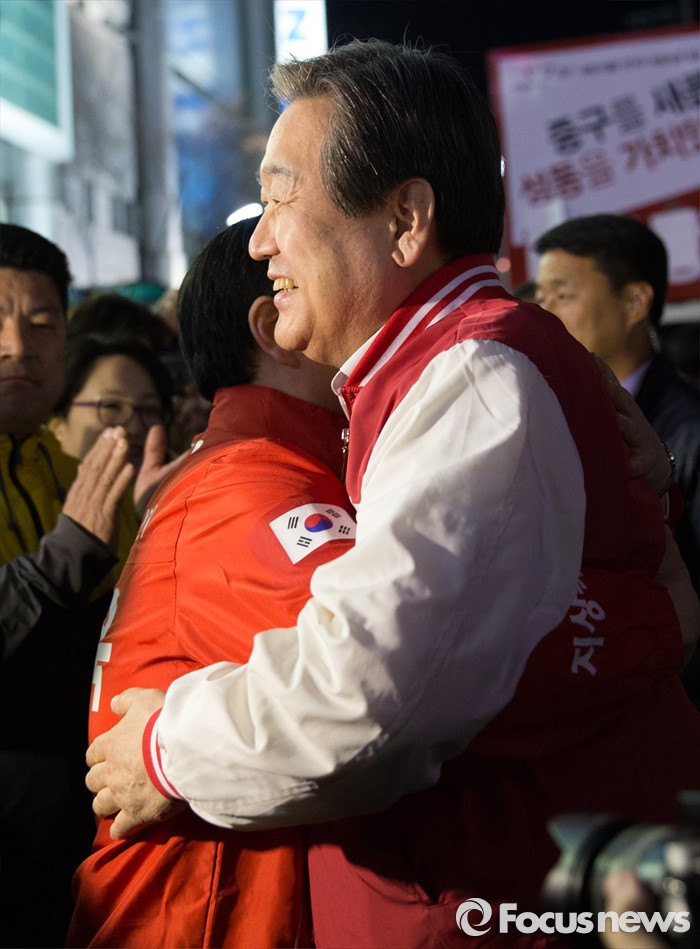(서울=포커스뉴스) 4.13총선 공식선거운동 첫날인 31일 오전 서울 중구 동대문 누죤 앞에서 김무성 새누리당 공동선대위원장이 지상욱 서울 중구성동구을 후보와 포옹을 하고 있다.