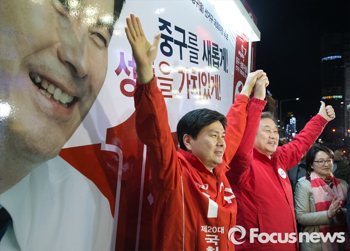 (서울=포커스뉴스) 4.13총선 공식선거운동 첫날인 31일 오전 서울 중구 동대문 누죤 앞에서 김무성 새누리당 공동선대위원장이 지상욱 서울 중구성동구을 후보와 선거유세차량 가림막 제거 후 만세를 외치고 있다.