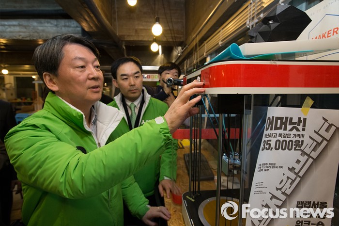 (서울=포커스뉴스) 4.13총선 공식선거운동 첫날인 31일 오전 서울 종로구 세운전자상가 '팹랩 서울(FABLAB SEOUL)'에서 안철수 국민의당 상임공동대표가 미래 일자리 청년 아카데미를 방문해 3D프린트기를 체험하고 있다.