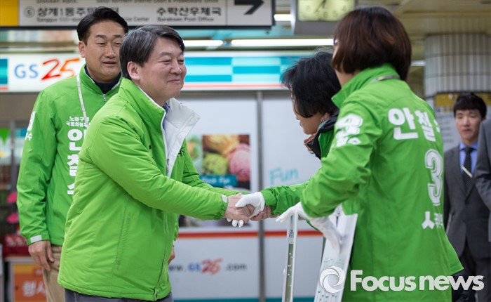 (서울=포커스뉴스) 총선 선거운동이 공식적으로 시작된 31일 오전 안철수 국민의당 노원병 후보가 서울 노원구 수락산역 역사 내에서 선거유세 봉사자들과 인사를 하고 있다.