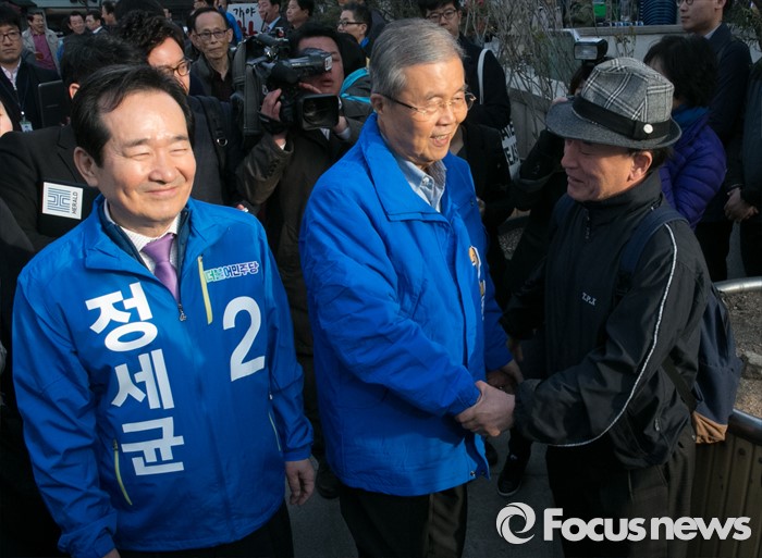 (서울=포커스뉴스) 20대 총선 공식선거 운동이 시작된 31일 오전 서울 동묘앞역 인근 거리에서 김종인(가운데) 더불어민주당 비대위 대표 겸 선대위원장과 정세균 서울 종로구 후보가 시민들에게 지지를 호소하고 있다.