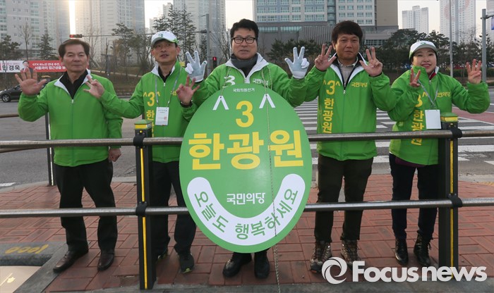 (인천=포커스뉴스) 제20대 총선 선거운동이 공식적으로 시작된 31일 오전 인천 연수구 한 사거리에서 한광원(가운데) 국민의당 연수을 후보가 출근하는 시민들에게 인사하며 지지를 호소하고 있다.