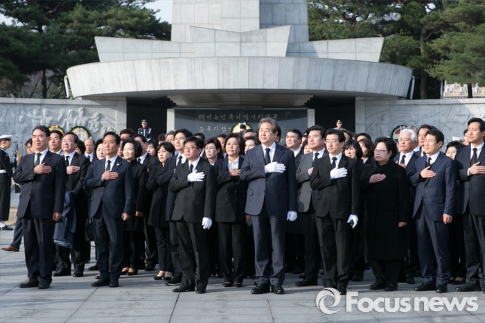 (서울=포커스뉴스) 4.13 총선 공식선거운동이 시작된 31일 오전 서울 동작구 국립현충원에서 김무성 새누리당 대표를 비롯한 지도부와 후보들이 국민의례를 하고 있다.
