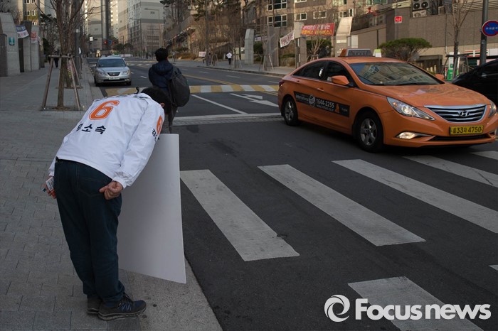 (서울=포커스뉴스) 20대 총선 공식선거 운동이 시작된 31일 오전 서울 마포구의 한 아파트 입구에서 강승규 무소속 마포갑 후보가 출근길 선거유세를 하고 있다.