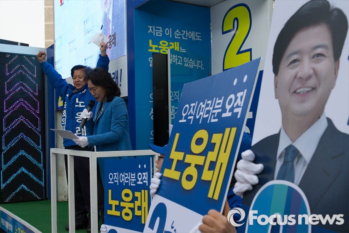 (서울=포커스뉴스) 20대 총선 공식선거 운동이 시작된 31일 오전 서울 마포구 공덕오거리에서 노웅래 더불어민주당 마포갑 후보가 출정식을 하고 있다.