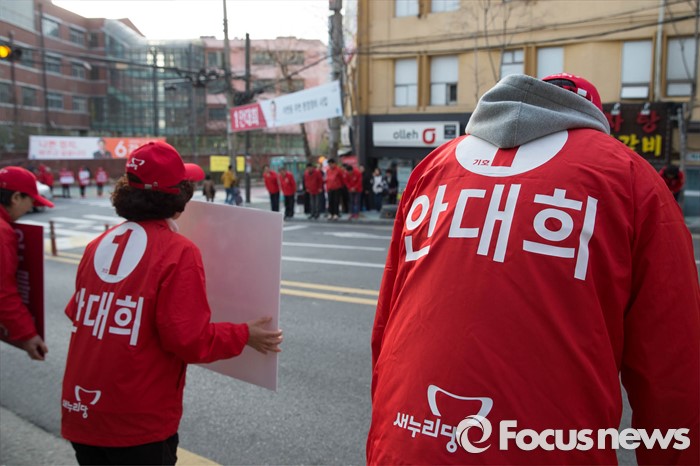 (서울=포커스뉴스) 20대 총선 공식선거 운동이 시작된 31일 오전 서울 마포구의 한 아파트 입구에서 안대희 새누리당 마포구갑 후보측이 출근길 선거유세를 하고 있다.