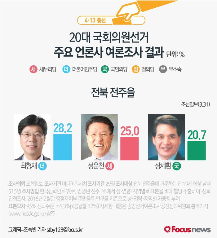 (서울=포커스뉴스) 31일 조선일보는 미디어리서치에 의뢰해 29일 하루동안 전북 전주을 유권자를 대상으로 여론조사를 한 결과, 더민주 최형재 후보의 지지율은 28.2%, 새누리당 정운천 후보의 지지율은 25.0%이라고 밝혔다. 국민의당 장세환 후보는 20.7%의 지지율을 보였다.