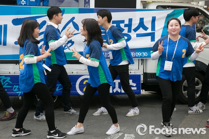(서울=포커스뉴스) 20대 총선 공식선거 운동이 시작된 31일 오전 서울 남대문시장에서 열린 더불어민주당 중앙선거대책위원회 출정식에 앞서 선거운동원들이 로고송에 맞춰 율동을 선보이고 있다.