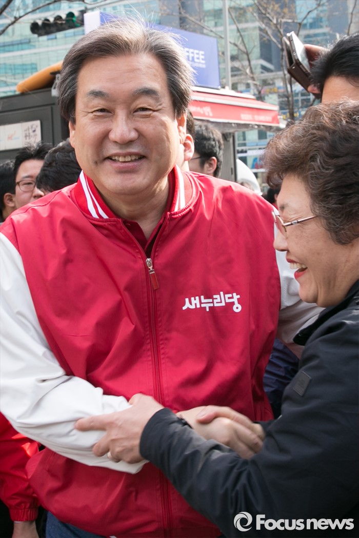 (서울=포커스뉴스) 4.13 총선 공식선거운동이 시작된 31일 오전 서울 구로구 구로디지털단지역 인근 한 대형마트 앞에서 김무성 새누리당 대표가 시민들과 손을 잡고 있다.