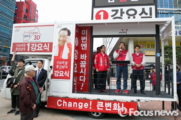 (서울=포커스뉴스) 4.13 총선 공식선거운동이 시작된 31일 오전 서울 구로구 구로디지털단지역 인근 한 대형마트 앞에서 김무성 새누리당 대표(오른쪽 두번째)가 강요식 구로을 후보 지원유세를 하고 있다.