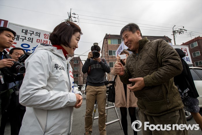 (대구=포커스뉴스) 무소속 대구 북구갑 권은희 후보가 31일 오전 대구 동구 공항교에서 열린 선거운동 출정식에 참석해 지지자와 대화를 나누고 있다.