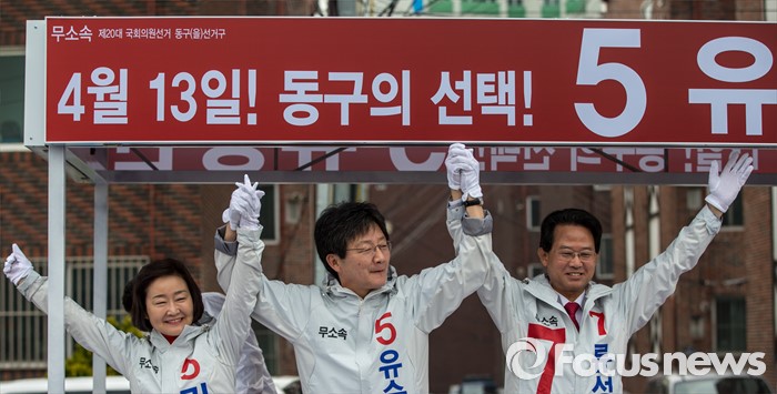 (대구=포커스뉴스) 무소속 대구 동구을 유승민(가운데) 후보, 무소속 대구 북구갑 권은희(왼쪽) 후보, 무소속 대구 동구갑 류성걸 후보가 31일 오전 대구 동구 공항교에서 열린 공동 출정식에 참석해 손을 맞잡고 있다.