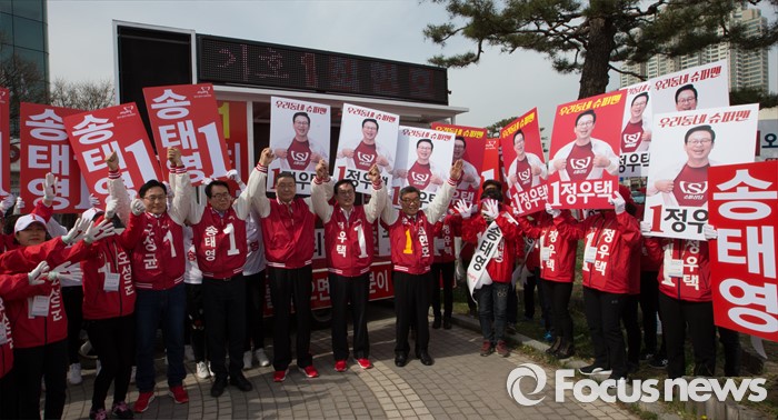 (청주=포커스뉴스) 20대 국회의원 선거유세가 시작된 31일 오전 충북 청주시 사직동 분수대 앞에서 새누리당 후보자들이 출정식을 갖고 필승을 다짐하고 있다.