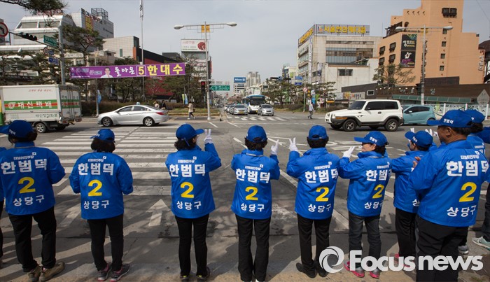 (청주=포커스뉴스) 20대 국회의원 선거운동이 시작된 31일 오전 충북 청주시 상당공원사거리에서 한범덕 후보 선거운동원들이 지지를 호소하고 있다.