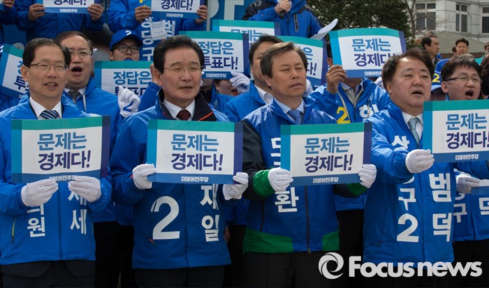 (청주=포커스뉴스) 20대 국회의원 선거유세가 시작된 31일 오전 충북 청주시 상당공원사거리에서 청주 더불어민주당 국회의원 후보자들이 출정식을 갖고 필승을 다집하고 있다.