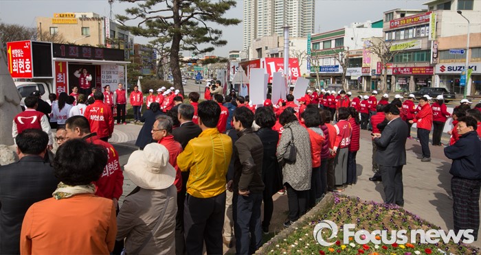 (청주=포커스뉴스) 20대 국회의원 선거유세가 시작된 31일 오전 충북 청주시 사직동 분수대 앞에서 새누리당 후보자들이 출정식을 갖고 필승을 다짐하고 있다.