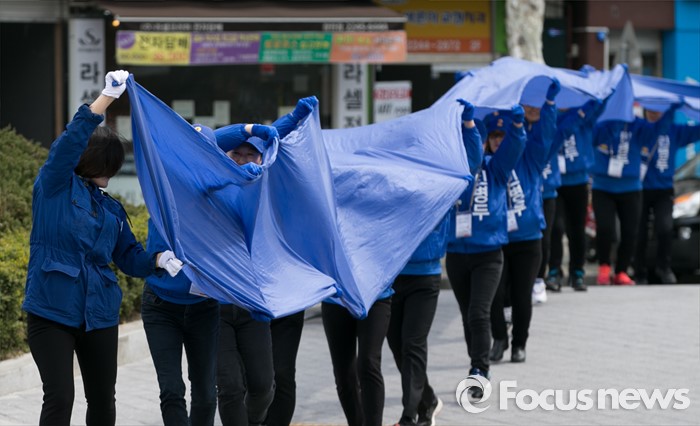 (서울=포커스뉴스) 20대 총선 공식선거 운동이 시작된 31일 오전 서울 장안동사거리에서 열린 민병두 더불어민주당 동대문을 후보 출정식에 참여한 선거운동원들이 퍼포먼스를 하고 있다.