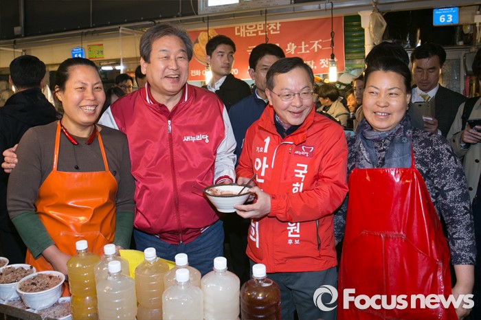 (서울=포커스뉴스) 4.13 총선 공식선거운동이 시작된 31일 오전 서울 마포구 아현시장에서 김무성(왼쪽 두번째) 새누리당 대표와 안대희(오른쪽 두번째) 마포갑 후보가 상인들과 기념사진을 찍고 있다.