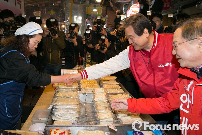 (서울=포커스뉴스) 4.13 총선 공식선거운동이 시작된 31일 오전 서울 마포구 아현시장에서 김무성(오른쪽 두번째) 새누리당 대표가 안대희(오른쪽) 마포갑 후보와 함께 상인들에게 인사하고 있다.