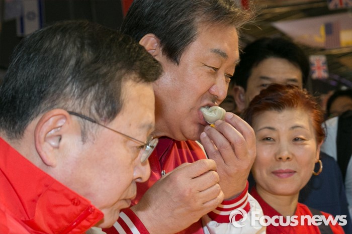 (서울=포커스뉴스) 4.13 총선 공식선거운동이 시작된 31일 오전 서울 마포구 아현시장에서 김무성(가운데) 새누리당 대표가 안대희 마포갑 후보와 함께 만두를 먹고 있다.