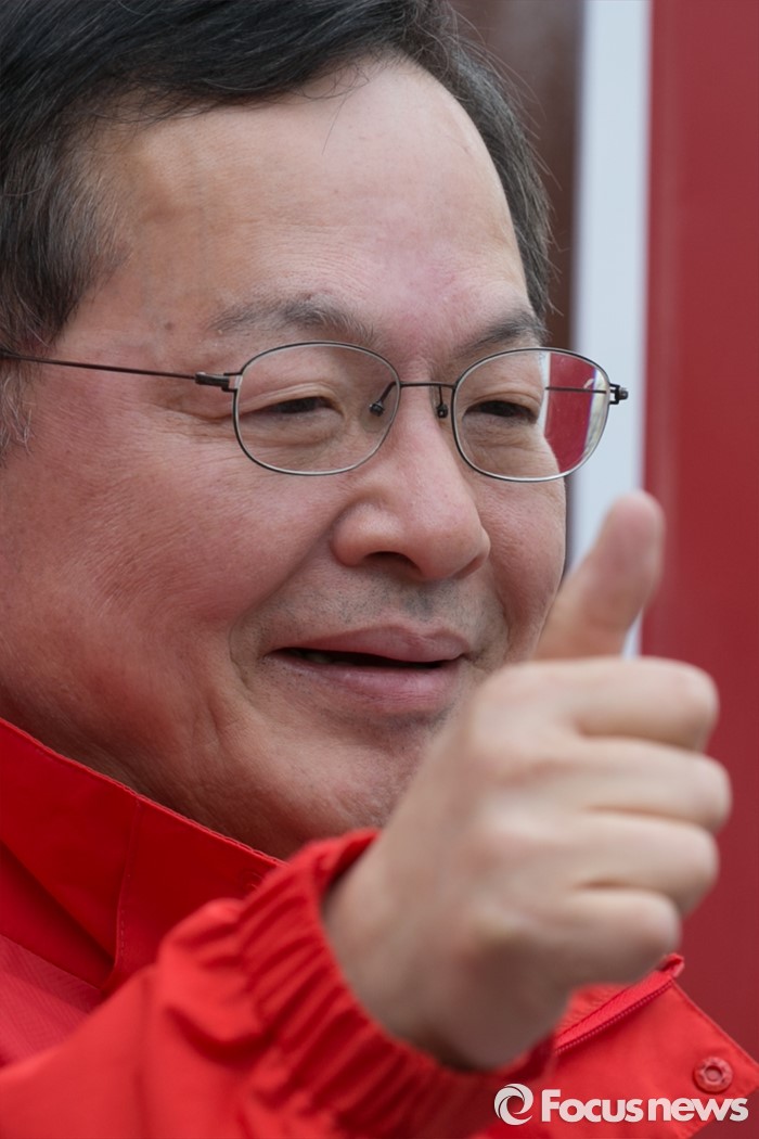 (서울=포커스뉴스) 4.13 총선 공식선거운동이 시작된 31일 오전 서울 마포구 아현시장에서 안대희 새누리당 마포갑 후보가 엄지를 치켜들고 있다.