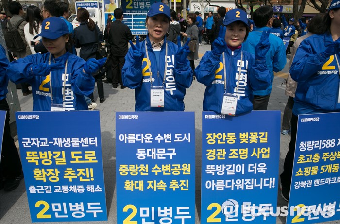 (서울=포커스뉴스) 20대 총선 공식선거 운동이 시작된 31일 오전 서울 장안동사거리에서 민병두 더불어민주당 동대문을 후보 선거운동원들이 지지를 호소하고 있다.