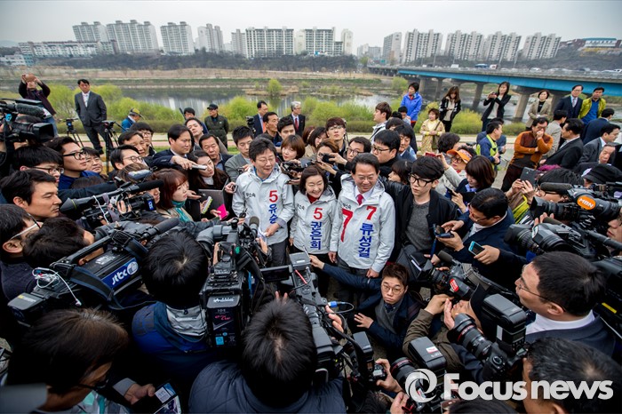 | △ 취재진에 둘러 싸인 유승민-권은희 류성걸 후보 |