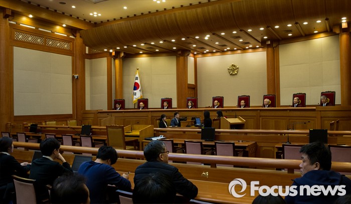 (서울=포커스뉴스) 23일 오후 서울 종로구 헌법재판소 대심판정에서 헌법재판관들이 성매매알선 등 행위의 처벌에 관한 법률(성매매특별법) 제21조 제1항에 대한 위헌성을 심판하고 있다. 헌법재판소는 성매매특별법에 대해 재판관 6대3 의견으로 합헌 결정했다.