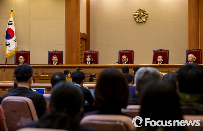 (서울=포커스뉴스) 23일 오후 서울 종로구 헌법재판소 대심판정에서 헌법재판관들이 성매매알선 등 행위의 처벌에 관한 법률(성매매특별법) 제21조 제1항에 대한 위헌성을 심판하고 있다. 헌법재판소는 성매매특별법에 대해 재판관 6대3 의견으로 합헌 결정했다.