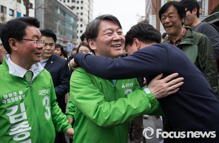 (서울=포커스뉴스) 총선 선거운동이 공식적으로 시작된 31일 오후 안철수 국민의당 상임공동대표가 서울 영등포구 여의도백화점 앞에서 김종구 영등포을 후보 지원 유세를 하던 중 한 지지자와 포옹하고 있다.