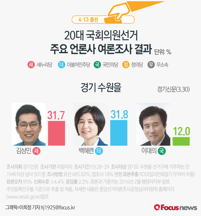 (서울=포커스뉴스) 경기신문이 리얼미터에 의뢰해 30일 발표한 여론조사 결과에 따르면 새누리당 김상민 후보의 지지율은 31.7%, 더불어민주당 백혜련 후보의 지지율은 31.8%, 국민의당 이대의 후보는 12.0%를 기록했다.