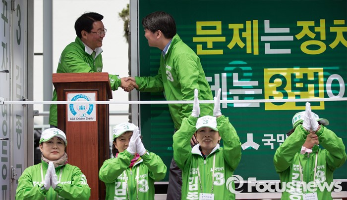 (서울=포커스뉴스) 총선 선거운동이 공식적으로 시작된 31일 오후 안철수 국민의당 상임공동대표가 서울 영등포구 여의도백화점 앞에서 김종구 영등포을 후보자와 악수하고 있다.