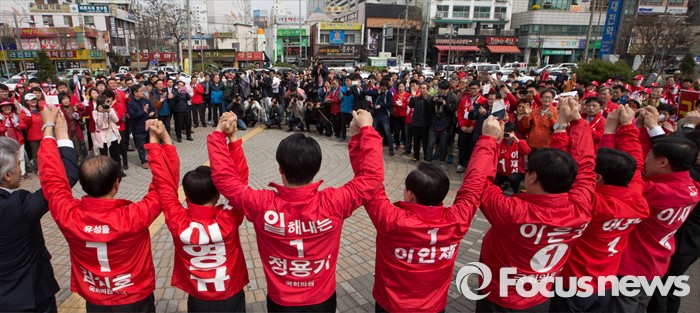 (대전=포커스뉴스) 31일 오후 대전 서대전역광장에서 열린 대전 새누리당 후보자 합동유세에서 후보자들이 필승을 결의하고 있다.