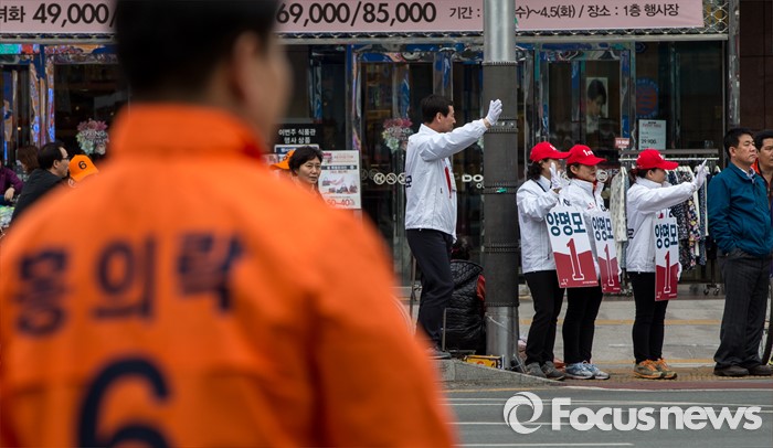 (대구=포커스뉴스) 무소속 대구 북구을 홍의락 후보가 31일 오후 대구 북구 칠곡네거리에서 선거운동을 하며 새누리당 대구북구을 양명모 후보 선거운동원들의 모습을 지켜 보고 있다.