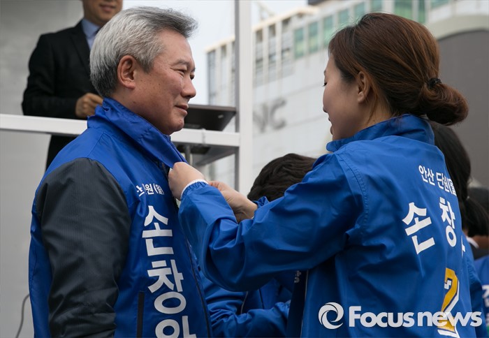 (안산=포커스뉴스) 20대 총선 공식선거 운동이 시작된 31일 오후 경기도 홈플러스 안산고잔점 앞에서 열린 더불어민주당 안산 집중유세에 참석한 손창원 안산 단원을 후보 내외가 자녀들로부터 스카프를 선물받고 있다.