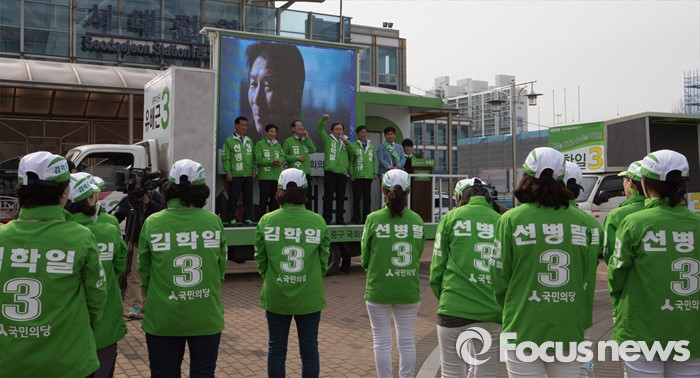 (대전=포커스뉴스) 31일 오후 대전 서대전역광장에서 열린 대전 국민의당 국회의원 후보자 출범식에서 후보자들이 지지를 호소하고 있다.
