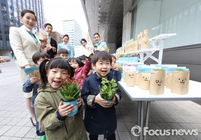 (서울=포커스뉴스) 대한항공은 식목일을 앞두고 서울 서소문 사옥 앞에서 DIY(Do it yourself)형 '잔디 지배 키트'를 고객과 시민들에게 나눠주는 행사를 열었다고 31일 밝혔다.