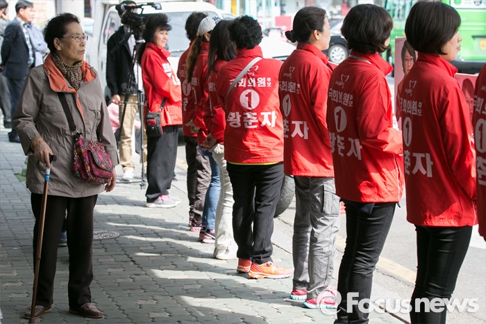 (서울=포커스뉴스) 4.13 총선 공식선거운동이 시작된 31일 오후 서울 용산구 후암시장 앞에서 어르신들이 황춘자 새누리당 용산 후보의 유세를 보고 있다.