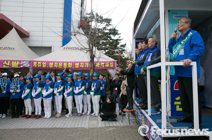 (안산=포커스뉴스) 20대 총선 공식선거 운동이 시작된 31일 오후 경기도 홈플러스 안산고잔점 앞에서 열린 더불어민주당 안산 집중유세에 참석한 김종인 비대위 대표 겸 선대위원장이 지지를 호소하고 있다.