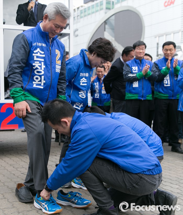 (안산=포커스뉴스) 20대 총선 공식선거 운동이 시작된 31일 오후 경기도 홈플러스 안산고잔점 앞에서 열린 더불어민주당 안산 집중유세에 참석한 손창원 안산 단원을 후보 내외가 사위들로부터 운동화를 선물받고 있다.