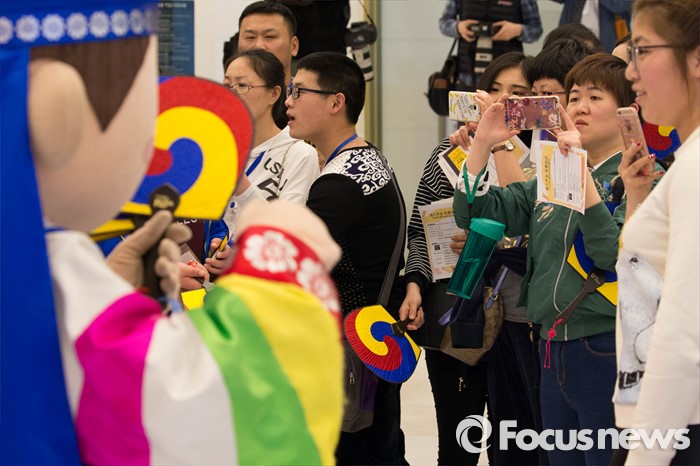 (서울=포커스뉴스) 한국을 방문 중인 중국 아오란 그룹 임직원들이 31일 오후 서울 용산구의 한 면세점을 찾아 홍보 캐릭터를 촬영하고 있다.