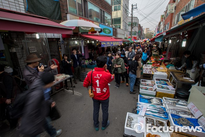 (대구=포커스뉴스) 새누리당 대구 수성구갑 김문수 후보가 31일 오후 대구 수성구 신매시장을 방문해 유권자들에게 한 표를 호소 하고 있다.