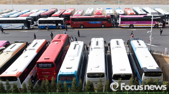 (서울=포커스뉴스) 31일 오후 서울 용산구 신라아이파크면세점 주차장이 중국 아오란 그룹 임직원들을 태우고 온 버스들로 가득하다.
