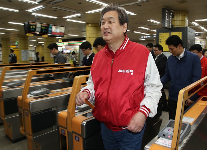 (서울=포커스뉴스) 20대 총선 공식선거 운동이 시작된 31일 오후 지원 유세에 나선 김무성 새누리당 공동선대위원장이 지하철 6호선을 이용해 이동하고 있다. <사진제공=새누리당>