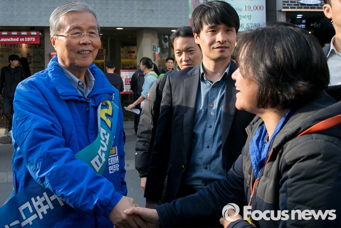 | △ 신촌 유세 마치고 유권자들과 악수하는 김종인 |