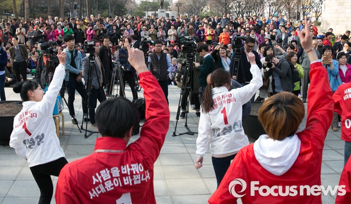 (서울=포커스뉴스) 4.13 총선 공식선거운동이 시작된 31일 오후 서울 서대문구 독립문공원에서 이성헌 새누리당 서대문갑 후보선거운동원들이 춤을 추고 있다.