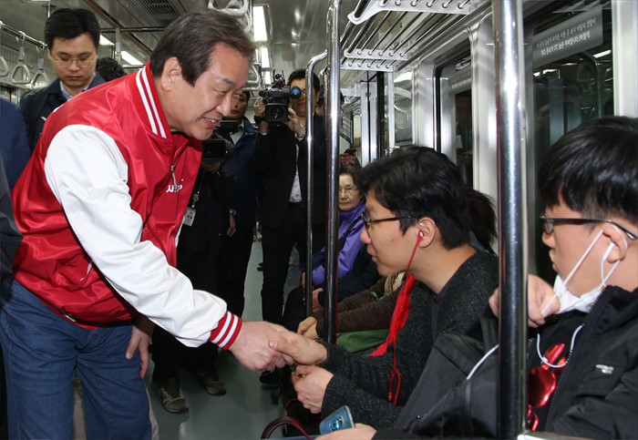 | △ 지하철 승객들 만나는 김무성 |