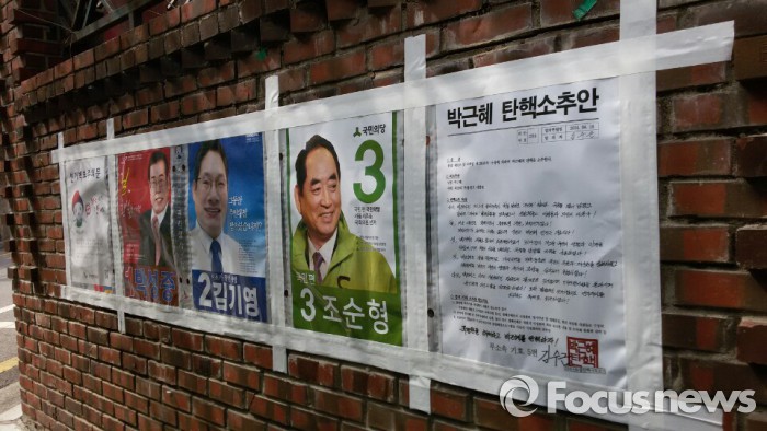 (서울=포커스뉴스) 20대 총선 공식 선거운동이 시작된 31일 서울 서초구 일대에는 '박근혜 탄핵소추안'이라는 글이 적힌 공식 선거벽보가 내걸렸다.